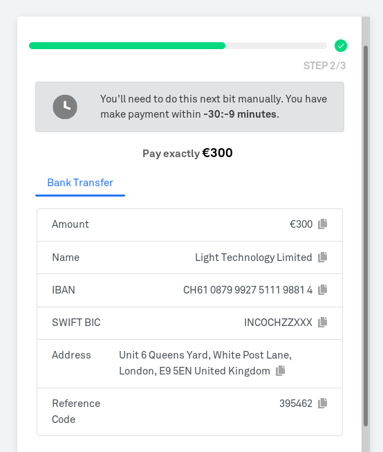 - Make a payment(through your previously chosen payment method) to the provided account details. An example can be found in the image shown below. (the information provided is based on your chosen fiat currency)